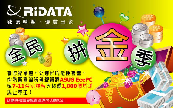 擺脫缺筆電、欠現金的最佳機會來嚕,錸德科技體恤您辛苦加班、賺錢不易的煩惱,推出 ”RIDATA 全民拼金季”活動,於活動時間內(2008/11/15 ~ 2009/02/28)止,凡購買指定品項之RIDATA光碟 & 隨身碟 & 記憶卡等系列產品,包裝內贈驚喜福袋即有機會將ASUS EeePC或7-11百元禮券等超過1,000個獎項馬上帶走! 除此之外,更有〝馬上省 4大終極絕招大揭露〞秘笈,讓您輕鬆擺脫「菜好貴」、「油好貴」、「電好貴」及「水好貴」等四大勞民傷財的民生陰影,成為抗漲小尖兵,省下辛苦血汗錢。同時,別忘了為期9天的台北資訊月11 / 29~ 12 / 7,RIDATA將與您在活動現場一同省荷包、拼經濟!