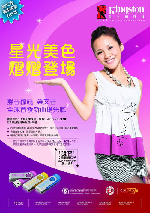 談到梁文音,觀眾朋友必定還印象深刻,一位擁有清脆嘹亮嗓音及廣闊音域的歌手,在電視超級星光大道選秀節目中,屢屢以動人的歌聲與豐富的情感,牽動所有觀眾的心弦。現在,搶先聆聽梁文音的動人歌聲與收藏專屬桌面鈴聲,您可以有更快速的方法。全球快閃記憶體領導製造廠商—Kingston,今日宣布與環球唱片合作,推出Kingston DataTraveler 101梁文音獨家限量合作版隨身碟,隨身碟內預先載入梁文音之全球首發魅力單曲、專屬主題桌面與超夯新曲鈴聲,Kingston以獨家的超值內容,讓所有喜愛梁文音的觀眾朋友,都能搶先聆聽她的動人新曲,並收藏她的點點滴滴。Kingston DataTraveler 101梁文音獨家限量合作版隨身碟是您不可錯過的梁文音收藏品。