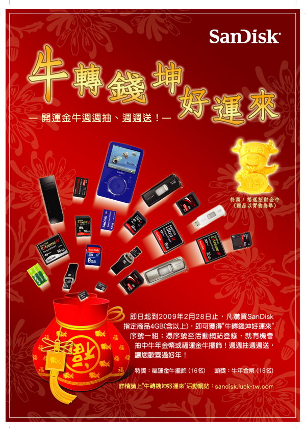 凡自即日起至2009年2月28日於全省經銷門市購買SanDisk全系列含記憶卡、隨身碟產品4GB容量以上,憑產品包裝附贈之活動貼紙,上網登入抽獎序號及資料填寫,就有機會獲得「福運金牛擺飾」一只或「牛年金幣」一枚!自2009年1月12日起,週週抽、週週送,過年期間更加碼送!就讓SanDisk為您珍藏新年吉祥喜氣,陪伴您歡歡喜喜過好年!