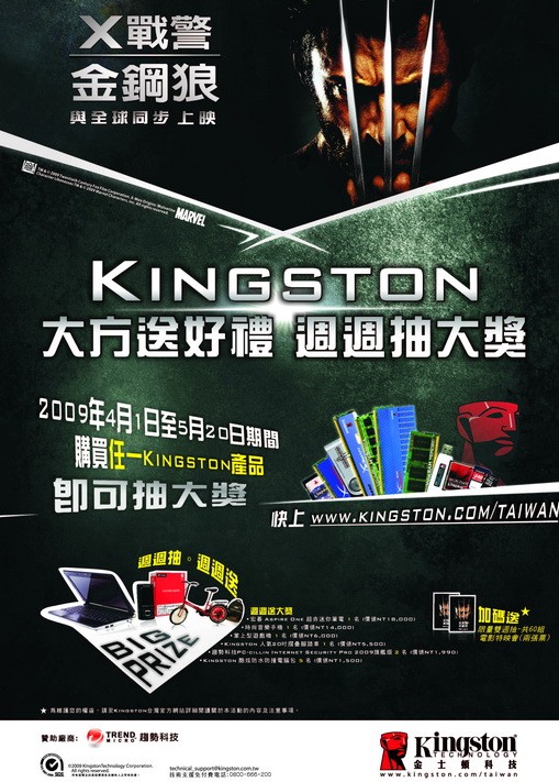 自4月1日到5月20日止,凡於活動期間購買任一Kingston產品,且上網進行認證成功者,即可參加超值好康抽獎活動!Kingston將於活動開始後每週三抽出幸運中獎者,並於每週五公佈於活動官網上 (www.kingston.com/taiwan) 。為吸引消費者進行線上認證,Kingston準備了眾多好禮相送,超夯贈品計有Acer Aspire One迷你筆電x1名 (市價NT18,000) 、時尚音樂手機 1名 (市價NT14,000)、掌上型遊戲機x1名 (市價 NT6,000) 、Kingston 人氣20吋摺疊腳踏車x1名 (市價 NT5,500) 、趨勢科技PC-cillin Internet Security Pro 2009旗艦版 x2名 (市價 NT1,990) 、與Kingston 酷炫防水防撞電腦包x5名 (市價 NT1,500)。此外,擁有超強卡司、年度最受矚目電影【X戰警:金鋼狼】即將上映,Kingston更推出「限量雙週抽X戰警特映電影票活動」,將於4月8日與4月15日各抽出30組電影票 (兩張票/組),並在4月10日及4月17日公佈得獎名單於活動官網上 (www.kingston.com/taiwan) ,讓消費者不但有最夯的獎品可抽,更有機會一睹震撼全球的暑期超級強檔電影!Kingston希望消費者能藉由網路驗證機制,避免購買到仿冒品的風險,充分享受Kingston所帶來的優異品質與絕佳的售後服務。