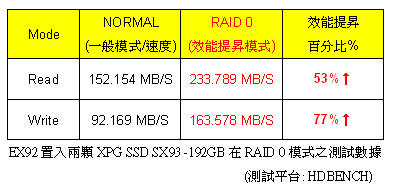 威剛EX92在RAID 0模式下,經過測試平台驗證,將XPG系列SX93 SSD的讀寫速度分別提昇53%及77%,亦即讀寫速度均有效提升至少原本的1.5倍以上(見表格)!另外,EX92 3.5吋SSD外接盒也可相容使用2個2.5吋硬碟,其RAID功能亦能有效提升硬碟功效。EX92 3.5吋SSD外接盒平實的價格可以讓使用者,用最經濟的方式,輕鬆將SSD或HDD效能升級,預計將成為最熱門的新一代記憶體週邊解決方案。