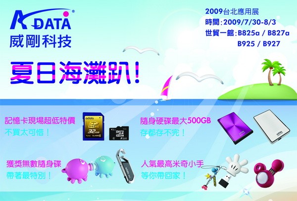 威剛科技(A-DATA),將在七月底登場的台北應用展上與你見面!威剛今年推出多項免費好康和產品優惠促銷方案,準備讓消費者雙手滿載而歸!威剛將以免費超值好禮回饋長期以來支持威剛的消費者。多元化的產品促銷優惠方案,讓你將最新隨身碟系列、外接式硬碟、超高速高容量記憶卡以及超可愛迪士尼系列商品通通帶回家!只要來威剛科技攤位,絕對拿好康、搶便宜,給你殺很大的透心涼!