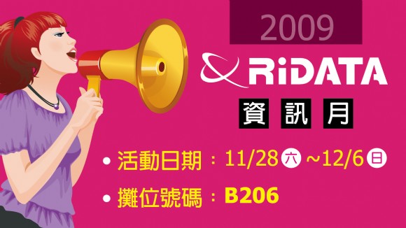 錸德科技年度盛事資訊月,將於11月28日至12月6日正式豋場,歡迎蒞臨錸德科技資訊月RIDATA攤位 (世貿一館 B206),現場除了必備的辣妹熱歌勁舞及熱銷產品驚爆價外,今年更推出空前熱鬧的現場活動,凡現場購買就有機會將黃金、機票、五星住宿免費帶回家! 現場攤位也規劃熱銷商品秒殺區,將不定時推出限量必敗商品,超優惠的精打細算組合,完全滿足輕鬆敗家的慾望。
