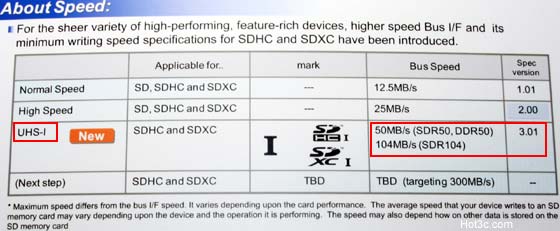 這是 SDA 協會 (SD Association) 新定義的 UHS 規格 (SD 3.01) 記憶卡,將原本只有 12.5MB/s ~ 25MB/s 速度上限的 SD/SD/SDXC,更擴展到 50MB/s ~ 104MB/s,以因應 USB 3.0 的高速時代來臨。目前仍然是第一代 UHS 版本,因此會特別用 I 來標示 UHS-1 。