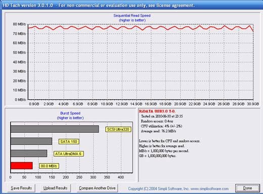 HDtach 實測 burst 就掉回 80MB/sec,平均存取速度為 76MB/sec,存取時間同樣是 0.4ms: