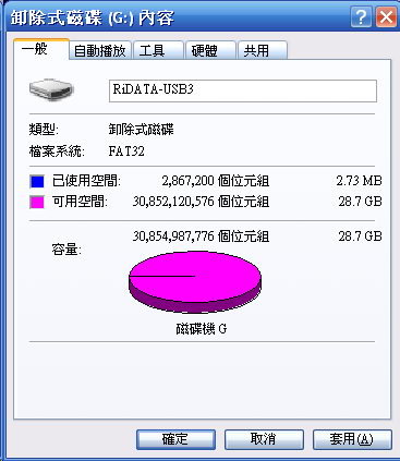 在檔案總管理,可看到這款 32GB 隨身碟容量有 30,854,987,776 Bytes, 顯示只有 28.7GB,其實不太符合 32GB 定義: