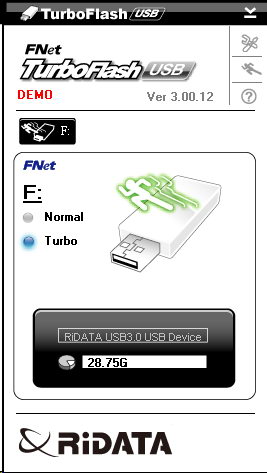 RIDATA HD5 有時尚黑、品味藍及個性紅三種顏色外觀顏色,我們借測的是亮眼的紅色。在隨身碟上也內建了一個 TurboFlash 軟體,這是 third-party 廠商幫 RiDATA 量身打造的軟體(也只能使用在這款隨身碟),應該是利用軟體 cache 來達到加速的效果。稍後我們會看看使用前、使用後的差異。