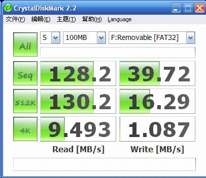 首先是 Crystal Disk Mark 實測,可看到讀取速度達 128MB/sec,寫入亦達約 40MB/sec: