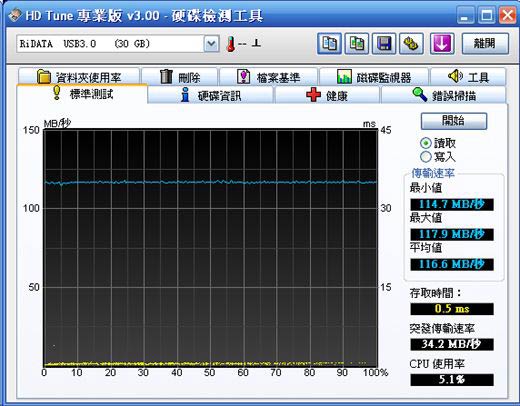 HD Tune 實測效能相當穩定,約為 117MB/sec,存取時間也只有 0.5ms: