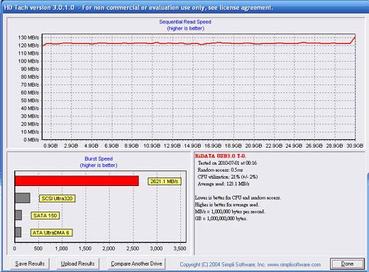 HDtach 實測 burst 竟然達 2621MB/sec,肯定是軟體 cache 造成的效果。不過平均存取速度也有 123MB/sec,存取時間同樣是 0.5ms: