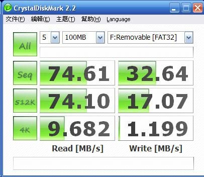 以下則是不啟用 Turbo 功能的實測。首先是 Crystal Disk Mark 實測,可看到讀取速度 75MB/sec,寫入則約 33MB/sec: