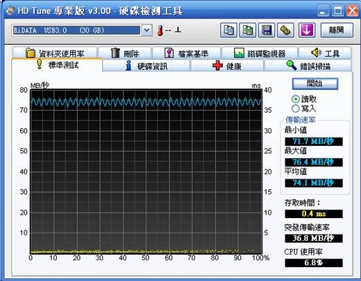 HD Tune 實測效能相當穩定,約為 74MB/sec,存取時間只有 0.4ms: