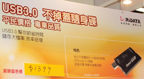RiDATA 這次主打 USB 3.0 隨身碟,16GB 超高速的伸縮接頭 HD7 展場價只要 $1399,另外還有抽獎送 1TB外接硬碟活動: