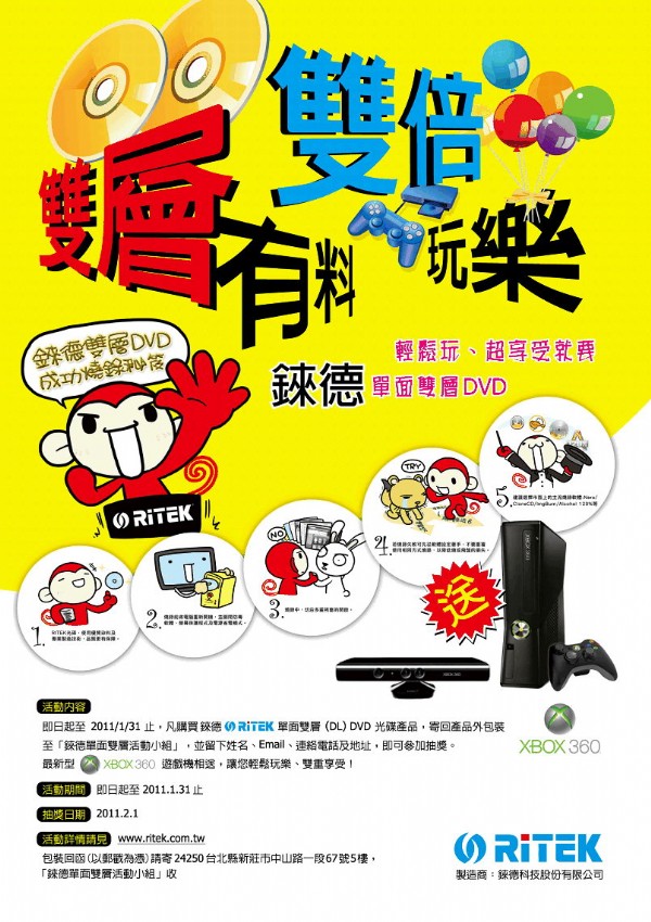 為了慶祝新年、回饋喜愛我們台灣在地品牌,並感恩大家的支持,錸德特別推出RITEK「雙層有料 雙倍玩樂 」活動回饋給大家,贈送時下最流行的X BOX 360和Kinect體感器。賀新年!就要讓您輕鬆玩樂、雙重享受!