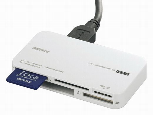 USB 3.0 讀卡機從去年 Computex 亮相以來,終於有正式產品準備出貨了,這是日商 Buffalo 所發表的 51合一BSCRA51U3 USB 3.0 讀卡機,共提供了五種插槽(SD/miniSD, xD, microSD, CF, MS/MS Duo),在 USB 3.0 介面下,存取速率最高可達 96.8MB/sec,比 USB 2.0 介面下的傳輸速率快了 3.4倍左右!並支援 Windows XP/Vista/7 以及 Mac 作業系統。