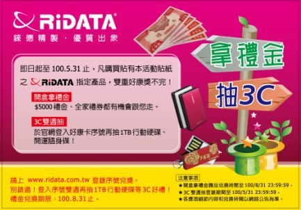 錸徳科技-其數位產品品牌RIDATA春季有驚喜,推出長達兩個月的「RIDATA 拿禮金 抽3C」好康開運活動,感恩回饋大家的支持與愛護。只要您至100. 05. 31止,購買任何貼有此活動貼紙之 指定產品,就有機會開運刮中超實用禮金$5000及全家禮卷!不僅如此,RIDATA好康拿不完,刮開包裝內的刮刮卡,憑序號上網登入,雙週連續再抽超大容量 1TB行動硬碟、開運隨身碟等3C一系列好禮!RIDATA超有誠意,越多購買、越早登錄,豐富好康帶越多哦!