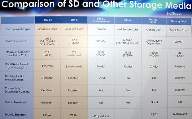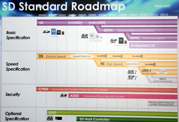 SD3.0 規格的 UHS-I 的 SDXC 才發表不久,現在 SDA 已經又在著手 SD 4.0新規格了,這次將是 UHS-II,存取速度將可達 312MB/sec,比起 UHS-I 的 104MB/sec快上三倍之多,預計將可在 2012下半年看到產品上市。在容量方面則仍將維持最高 2TB,不過目前市面上最高容量的 SDXC 也還只有 128GB,離 2TB 上限還有一段距離。SDXC 在速度上不斷的提昇,但仍有待相機廠商能配合同時發展,否則徒然有高速的記憶卡,還是很難在 DSLR或高階相機上享受到高速連拍高速寫入的快感!