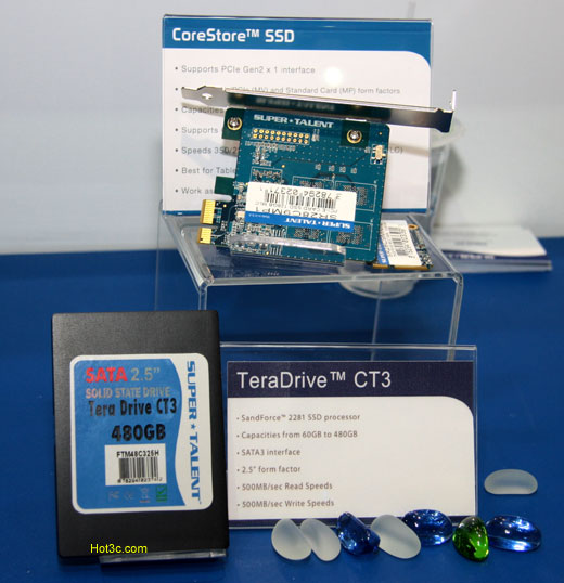 Super Talent 在 Computex 2011 展出最新 TeraDrive CT3 高速 SSD,採用了 SandForce 2281 控制器以及支援 SATA 6Gb/s 介面,最高讀、寫速率都超過了 500MB/sec,可說是一款超高速產品。目前最高容量則有 480GB。