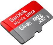 64GB SanDisk Mobile Ultra microSDXC記憶卡:SanDisk推出64GB microSDXC記憶卡,可以為最新、最頂級的智慧型手機與平板電腦擴充一倍以上的儲存空間。SanDisk最新的UHS超高速度高容量記憶卡的傳輸速度高達每秒30MB4,Class 6的效能表現正是錄製Full HD高畫質影片時所需;其規格與所有配備microSDXC 記憶卡插槽的平板電腦或智慧型手機相容。