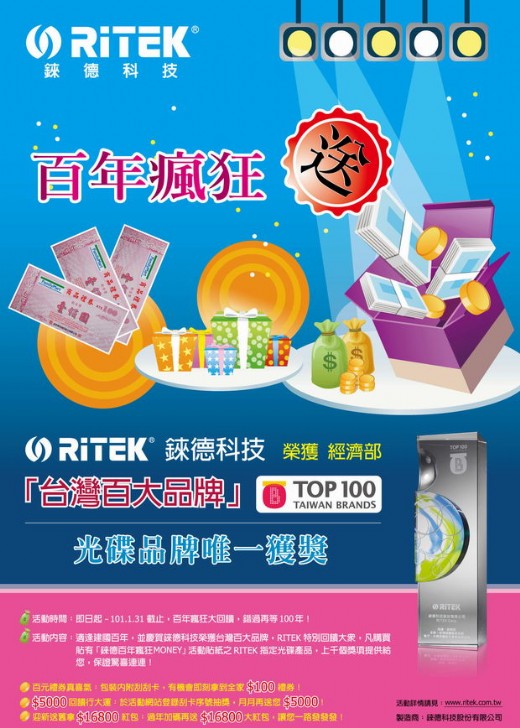 慶賀 RITEK 錸徳科技榮獲經濟部頒發之台灣百大品牌,也歡喜向民國100年說再見,您是否也想要抽中開運好禮為新的一年帶來新的喜氣以及希望呢?在歲末年初之際,錸德特別推出「RITEK 百年瘋狂送MONEY」活動,上千份禮金獎項,保證喜氣連連,財源滾滾!(更多活動詳情,請見:www.ritek.com.tw)