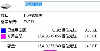 在檔案總管理,可看到這款 16GB 隨身碟容量有 15,419,957,248 Bytes, 不太符合 16GB 定義, Windows 下顯示也只有 14.3GB: