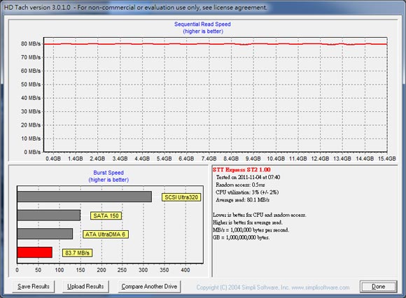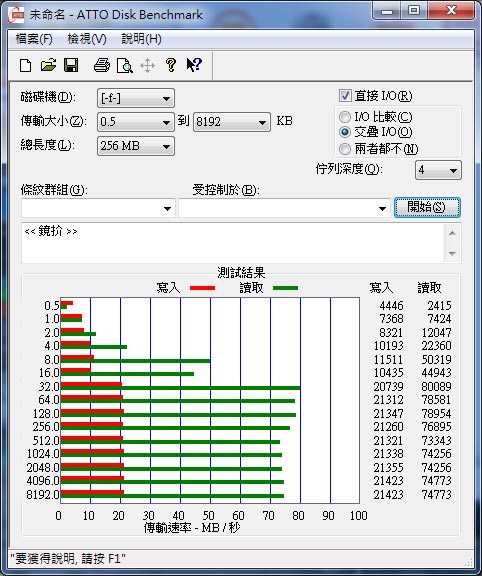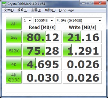 HDtach 實測平均存取速度則達 80MB/sec,存取時間同樣是 0.5ms: