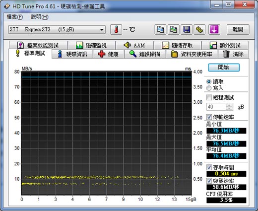 HD Tune 實測效能相當穩定,約為 76MB/sec,存取時間更只有 0.5ms: