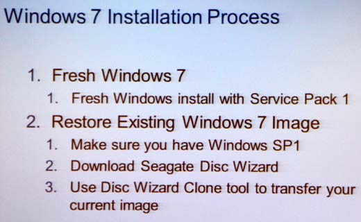 如果用戶準備在這款硬碟上重新安裝作業系統的話,只要是 Windows 7 SP1 或 Vista 或 Apple OSX 都可直接安裝,但如果是 Windows XP 的話則必須先在其他電腦上 Seagate Disc Wizard 來格式化這款硬碟。如果要將舊系統移轉到這顆新硬碟上,也必須使用 Seagate Disc Wizard 來進行移轉。以下是 Seagate 建議的安裝方式:
