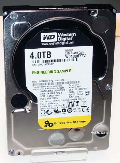 本週在南港世貿展覽館舉辦的台北國際資訊安全科技展(Info Security),WD 展出了尚未發表的 RE4 企業級 4TB 超大容量硬碟(工程版 WD4000FYYZ )。從外表的標籤可看出,這是搭載 64MB cache 的新硬碟,產地則是馬來西亞。現場工作人員也表示這款硬碟採用單碟 1TB 設計,預計今年稍後會上市。