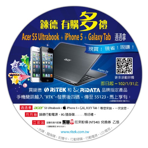活動名稱:錸德 有購多禮 Acer S5 Ultrabook + iPhone 5 + Galaxy Tab 通通拿