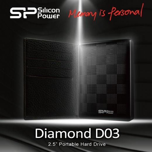 SP廣穎電通今日發表最新款USB 3.0行動硬碟Diamond D03。結合超高效能與時尚都會設計,D03外觀融合經典圖騰元素設計,如口袋般大小的輕薄機身搭配最新USB 3.0傳輸介面,是商務人士攜帶高容量珍貴資料與展現專業品味的最佳3C配件。