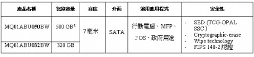 台灣東芝發布了首款通過美國聯邦資訊處理標準140-2 (FIPS)認證的自我加密型硬碟MQ01ABUxxxBW系列,不僅為輕薄型行動等級、厚度僅7毫米,更統整了 Toshiba 獨特的清除技術,即當此系列硬碟經由未註冊的系統進行存取時,將會自動清除資料。Toshiba的自我加密型硬碟同時也具備 TCG (Trusted Computing Group) 的 Opal SSC (Security Sub-Classification),這項廣為全球所接受的標準,能輔助如資訊部門經理、機密性管理應用程式供應商及專業安全性用戶端更完善的管理資料安全性,並防範對機密性資訊造成潛在的損壞及資訊外洩帶來的嚴重代價。全新系列獲得FIPS 的認證,通過 FIPS 140-2 的標準,認證到二級,此外,更提供了防竄改標籤(Tamper-evident labeling)以增加額外的安全性。