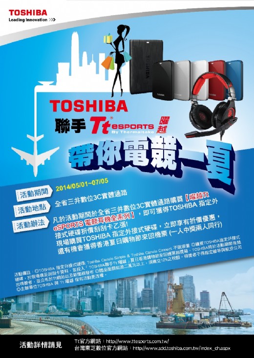 台灣東芝與曜越Tt eSPORTS聯手,於銷售通路三井數位3C舉辦夏日特別企劃活動—【TOSHIBA聯手 Tt eSPORTS曜越 帶你電競一夏】,自5月1日至7月5日,於全省三井數位3C實體通路購買「曜越Tt eSPORTS 電競耳機全系列」,即可獲得TOSHIBA 指定外接式硬碟折價刮刮卡乙張;現場購買外型洗鍊的TOSHIBA Canvio Simple外接式硬碟或大容量的Canvio Connect外接式硬碟,便可立即享有折價優惠,還有機會獲得香港夏日購物節來回機票 (一人中獎兩人同行)。好產品加上好價格,將帶給使用者最超值的消費體驗。