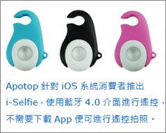 Apotop的i-Selfie愛‧自拍企鵝機,使用藍牙4.0介面進行遙控,模擬音量+鍵設計,不需要另外下載App,只要使用iOS內建的相機即可拍照,另外只要是支援音量+鍵拍照的照相軟體也都可以使用。i-Selfie設定與操作相當容易,只要手機經過藍牙配對,在手持手機自拍時,輕按遙控器,即可輕鬆遙控自拍,不會再因為手按拍照鍵晃動而造成畫面模糊。除了自拍使用之外,在高角度、低角度、會議記錄拍照時,不再受限拍照鍵位置,使用遙控器可更靈活拍照,i-Selfie愛‧自拍企鵝機特殊巧思設計,在遙控器上結合了手機支架創意,並附上耳機孔吊飾設計,可隨身攜帶,讓消費者隨時隨地享受遙控拍照的樂趣。