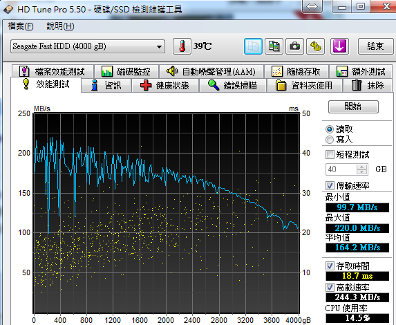 HDTune 實測也有 164.2MB/sec 的平均讀取速率,存取時間為 18.7ms: