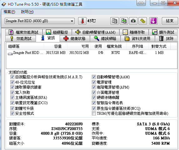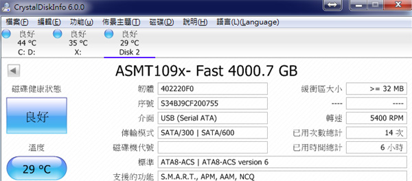 從 CrystalDiskInfo 可看到使用的控制晶片是 ASMT (ASMedia Technology) 出廠的,ASMedia 控制晶片產品在主機板產品都有不錯的好評。內建的硬碟則是 5400rpm: