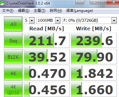 以下我們使用的測試平台 ASUS P8B75-M LX Plus 主機板搭配合 HighPoint 的 RocketU 1144A USB 3.0 擴充卡、Intel i5-3470 CPU @ 3.2GHz、16GB DDR3,作業系統則是 Windows 7 Professional 64-bit。首先使用 Crystal Disk Mark 實測,可看到讀/寫效率高達 210MB/sec以上,比許多 3TB 內接硬碟有過之而無不及: