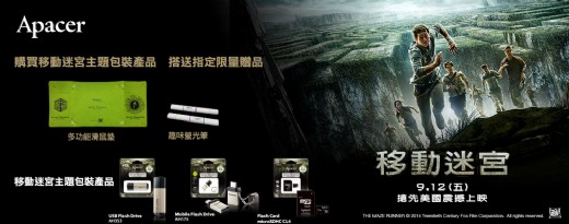全球青少年驚悚奇幻小說又一暢銷鉅作改編 【移動迷宮】挑戰比【饑餓遊戲】更嚴峻的關卡,配合福斯電影「移動迷宮」全球上映,Apacer宇瞻同步在全球推出「唯有生存,才能解開謎團」系列活動,凡購買Apacer宇瞻所推出的限量「移動迷宮」電影主題包裝產品,即有機會獲得移動迷宮與Apacer宇瞻聯名推出的電影相關紀念品: 探險家帽、精美遮陽簾、多功能滑鼠墊、趣味螢光筆、…等,數量有限、送完為止。