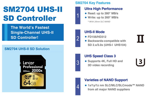 慧榮科技宣佈推出全球最高速度UHS-II (Ultra High Speed Phase II) 單通道SD卡控制晶片—SM2704,支援SD卡最高等級標準UHS-II 匯流排介面及最高傳輸U3等級速度,讀取速度最高可達每秒280MB,寫入最高可達每秒260MB,並保證每秒至少30MB的效能,提供足夠的頻寬來處理高畫質4K、Full HD、3D影片錄影或播放及超高速連拍,為專業級的SD卡打造領先業界的高效能傳輸速度。