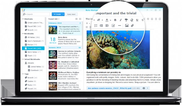 · Note Station 及 DS note:透過網頁瀏覽器或行動裝置即可建立、集中管理、同步和分享所有數位筆記。使用者能夠受益於許多進階功能,例如多媒體筆記、編輯歷史和密碼保護等,更支援從 Evernote 匯入筆記。