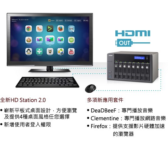 使用者現在可透過 HD Station 2.0 享受更多的應用,包含專門為本地播放而設計的知名音樂播放軟體 DeaDBeeF,其支援廣泛音訊格式、運作時使用更少系統資源,讓使用者可直接透過 HDMI 聆聽音樂,或透過 DeaDBeeF提供的等化器進行音樂調整,享受更多播放音樂樂趣;Mozilla Firefox 網路瀏覽器,支援硬體加速播放影片,讓網路影片播放更為順暢;新版 XBMC 加入全新的HD Player 佈景主題,整合了 QTS 多媒體管理中心以及 Turbo NAS 使用者權限控管機制,使用者可更方便地透過 XBMC 播放 QTS 多媒體檔案;Clementine 網路音樂播放套件,支援多種網路音樂平台,可輕易播放個人網路的音樂。