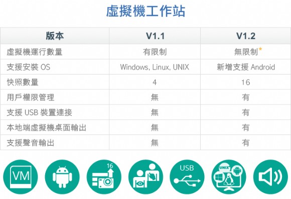 威聯通科技 (QNAP Systems, Inc.) Virtualization Station 虛擬機工作站 1.2 版本正式提供用戶下載,新增虛擬機用戶帳號管理、支援 Android 作業系統、可外接 USB 裝置、增加虛擬機快照數量,並支援透過 HDMI 直接輸出虛擬機桌面等功能。