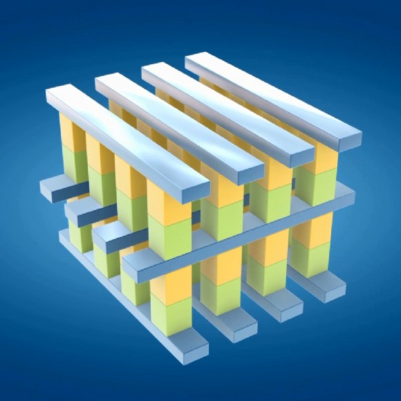 • 可堆疊 – 除了緊湊的交叉陣列結構外,記憶體儲存單元還會堆疊成好幾層。初期的技術每個晶粒能儲存128Gb,並有堆疊成兩層的記憶體元件;未來世代的技術將提高記憶體元件層的數量,再加上傳統顯影電路的微縮化,將能進一步提升系統容量。