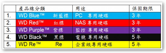 WD台灣總經理郭德麟表示:「WD在業界首創以不同顏色標籤區分各種功能專用的硬碟,讓消費者可更容易且迅速的挑選到符合自己使用需求的硬碟產品,多年來在DIY通路市場反應極佳,成效卓然。但由於IT應用日趨多元化,新的硬碟產品也日趨多樣,近來常接獲經銷夥伴以及消費者反應,若品項過多在銷售或選購時易生混淆,因此,WD決定簡化顏色分類,將3.5“內接式硬碟依保固期限整合為兩大產品系列 : 三年保固系列 及 五年保固系列,為消費者帶來更多方便。」