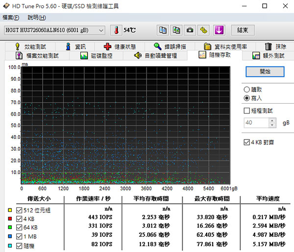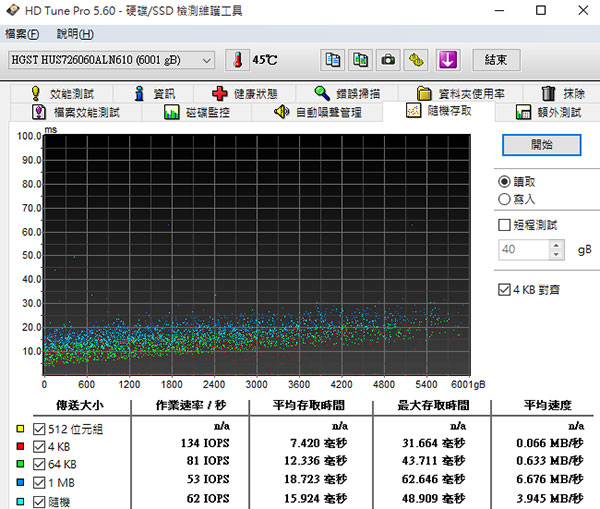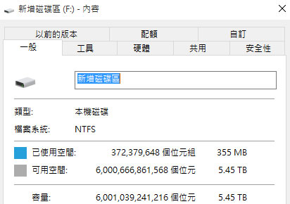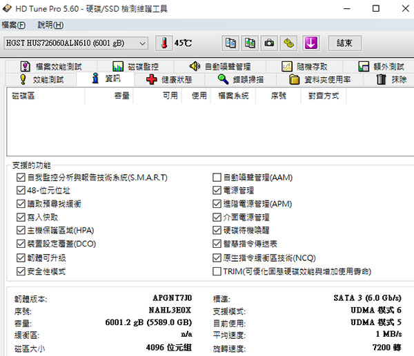 由 HDTune 則可看到 sector 大小為 4096bytes,HGST 另外也有推出 512bytes 版本。6TB 在 Windows 裡會顯示為 5589GB (1024進位制):