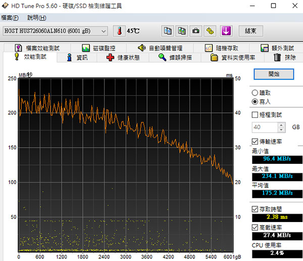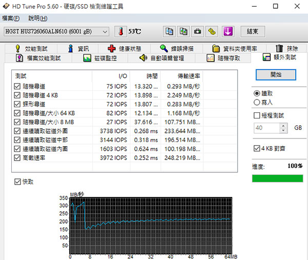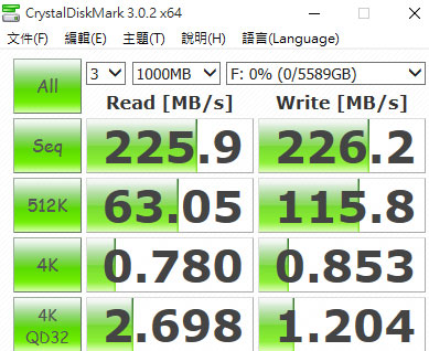 連續讀寫速率均高達 225MB/sec 以上,表現比我們先前測試的 8TB 的氦氣充填硬碟表現還快。