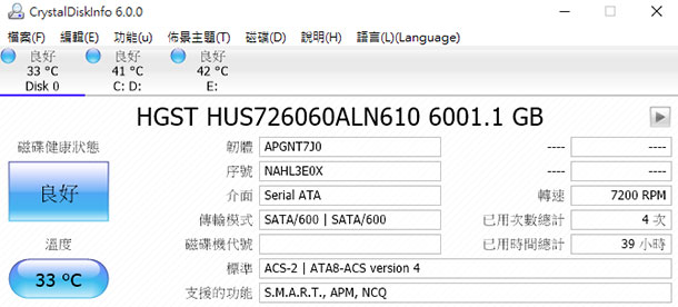 從 CrystalDiskInfo 可看到轉速為 7200rpm,cache 容量則未偵測到(規格表載明為 128MB):
