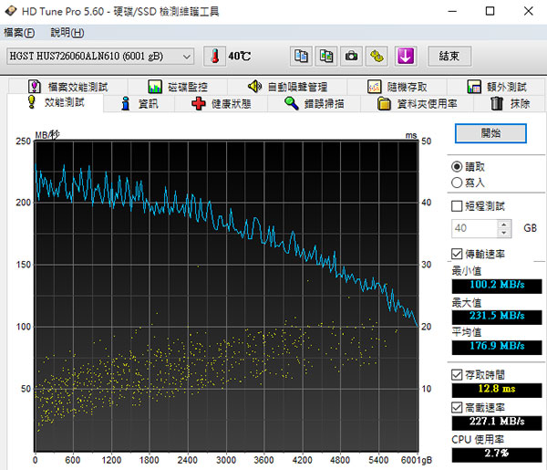 接下來則是 HDTune 測試表現,可看到最高速率達 231MB/sec,內圈也有 100MB/sec 以上,存取時間則為 12.8ms: