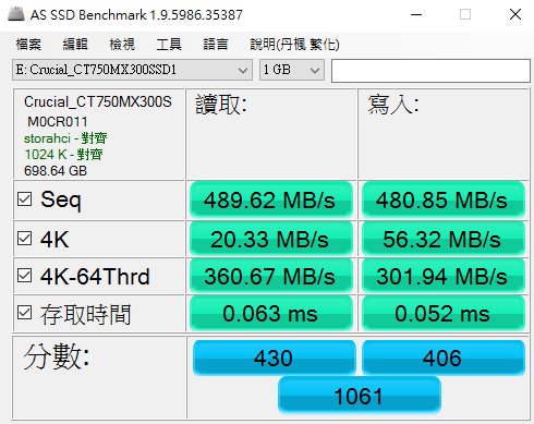 接下來使用 AS SSD Benchmark 實測,由下表可看到循序讀寫速率約 490MB/c、481MB/s,4K-64thrd 的讀取 IOPS 則高達 92332,也與官方宣稱的 92K 符合,但寫入的 77295 的稍稍不足官方 82K 寫入 IOPS。