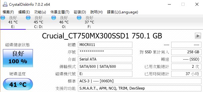 使用 CrystalDiskInfo 可看到支援 S.M.A.R.T., APM, NCQ, TRIM, DevSleep 等功能,也能看到目前累計的寫入資料量(用以估計 SSD 壽命):